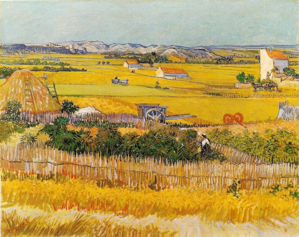 En février 1888, Vincent van Gogh arrive à Arles, après avoir passé deux années à Paris. Il est fasciné par les ruines de l’abbaye de Montmajour qui se dressent au dessus d’une vaste plaine. En mai 1888, il entame une série de dessins, la série Montmajour. Dans son célèbre tableau intitulé La Moisson (ou La Plaine de la Crau), il représente un champ de blé avec, au centre de la toile, une charrette bleue. Il ajoute un peu plus loin une autre charrette bleue, tirée par des chevaux. Une troisième, sur la droite du tableau, ne semble pas peinte, du moins pas de la même couleur. Avec cette œuvre de , Van Gogh désire représenter l’été. Les couleurs chaudes des champs de blé contrastent fortement avec le ciel bleu et les champs de lavande bleu-violet des Alpilles, champs qui entourent aussi l’abbaye. En évoquant La Moisson, Vincent écrit à son frère Theo : Il faut que j’arrive à la fermeté de couleur que j’ai dans cette toile qui tue les autres. Alors peut-être, je suis sur la piste et mon œil se fait-il à la nature d’ici. Attendons encore pour en être sûr.