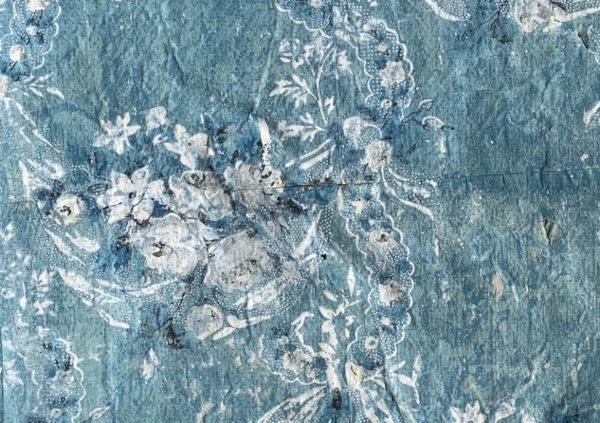 Papier peint des années 1820-1830, imprimé à la planche et à la détrempe sur des feuilles de papier chiffon raboutées, château de Taussac. La couleur rose est complètement décolorée, mais le bleu est resté très vif. Photo Hélène Charbey.